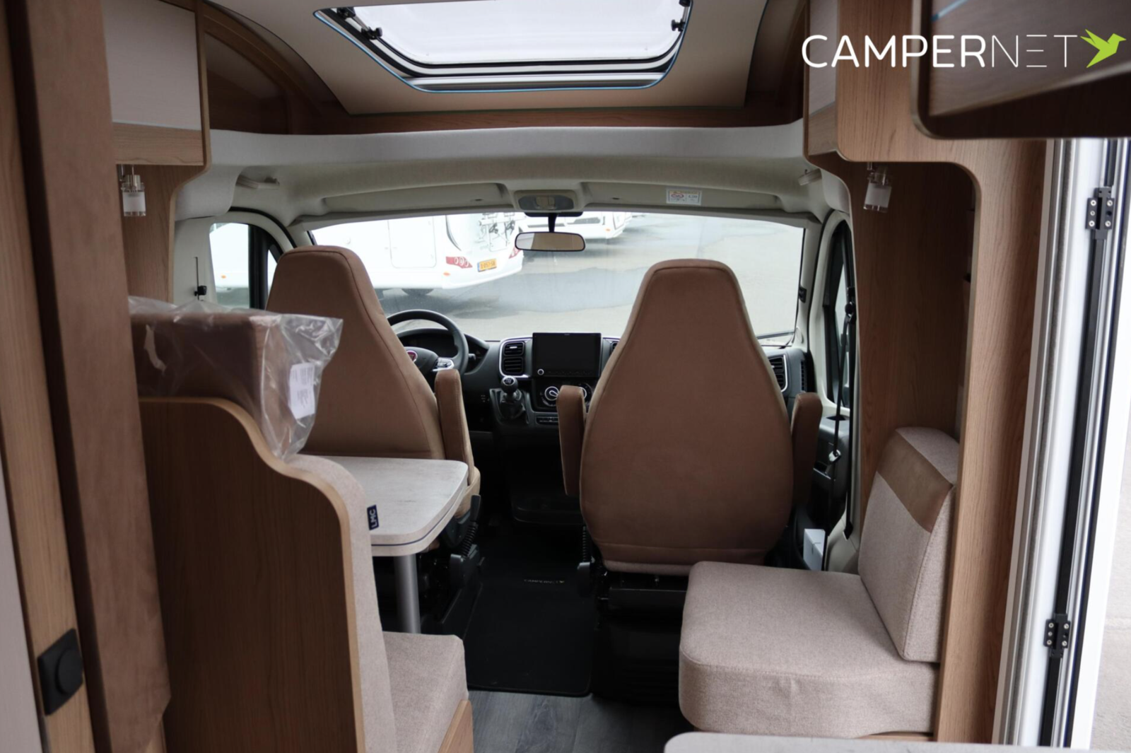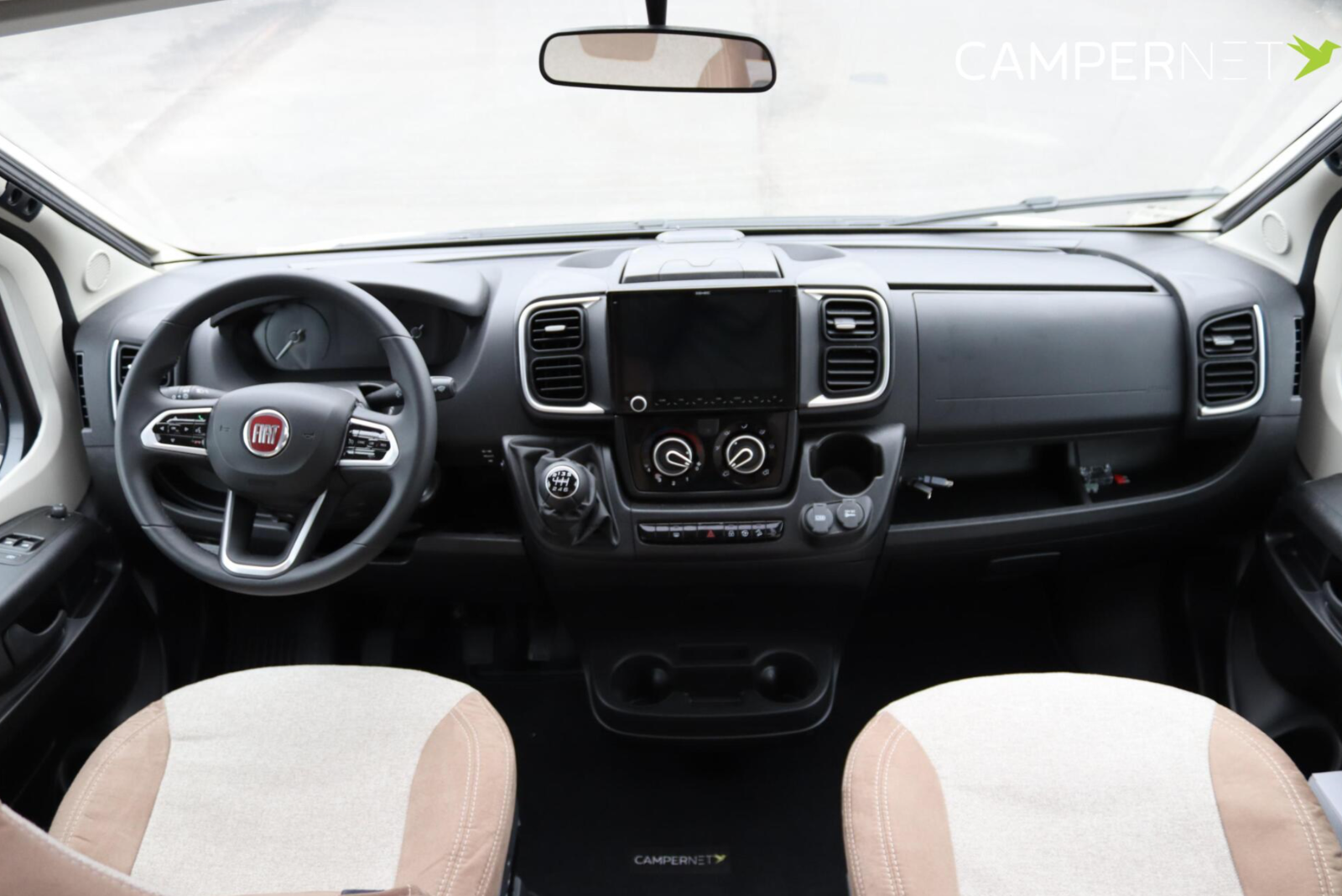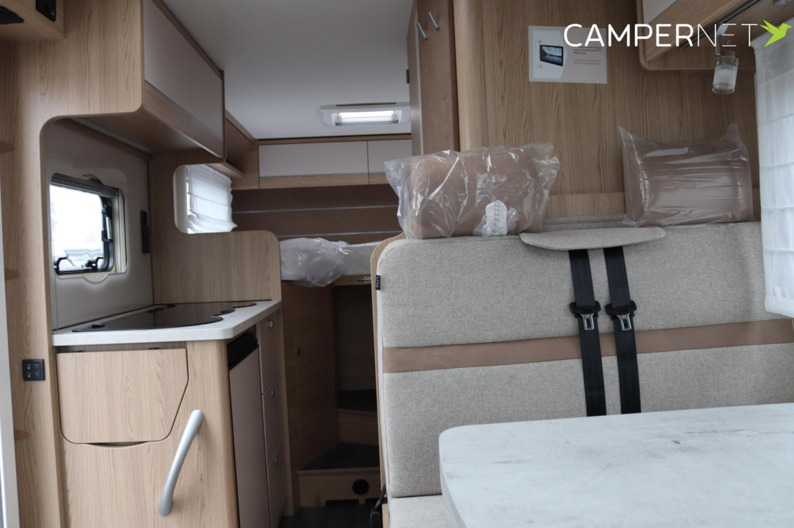 Verder beschikt deze camper over een ruime douche- en toiletcombinatie, voorzien van warmwater. De praktische koelkast met vriesvak wordt uitgevoerd in een ruime uitvoering. In de badkamer vindt u een wastafel om u op te frissen, daarnaast een ingebouwd cassettetoilet. De warme lucht wordt verspreid door luchtkanalen voor een compacte verwarming. Omdat deze camper met een hordeur is uitgerust, heeft u in de camper geen last van insecten.